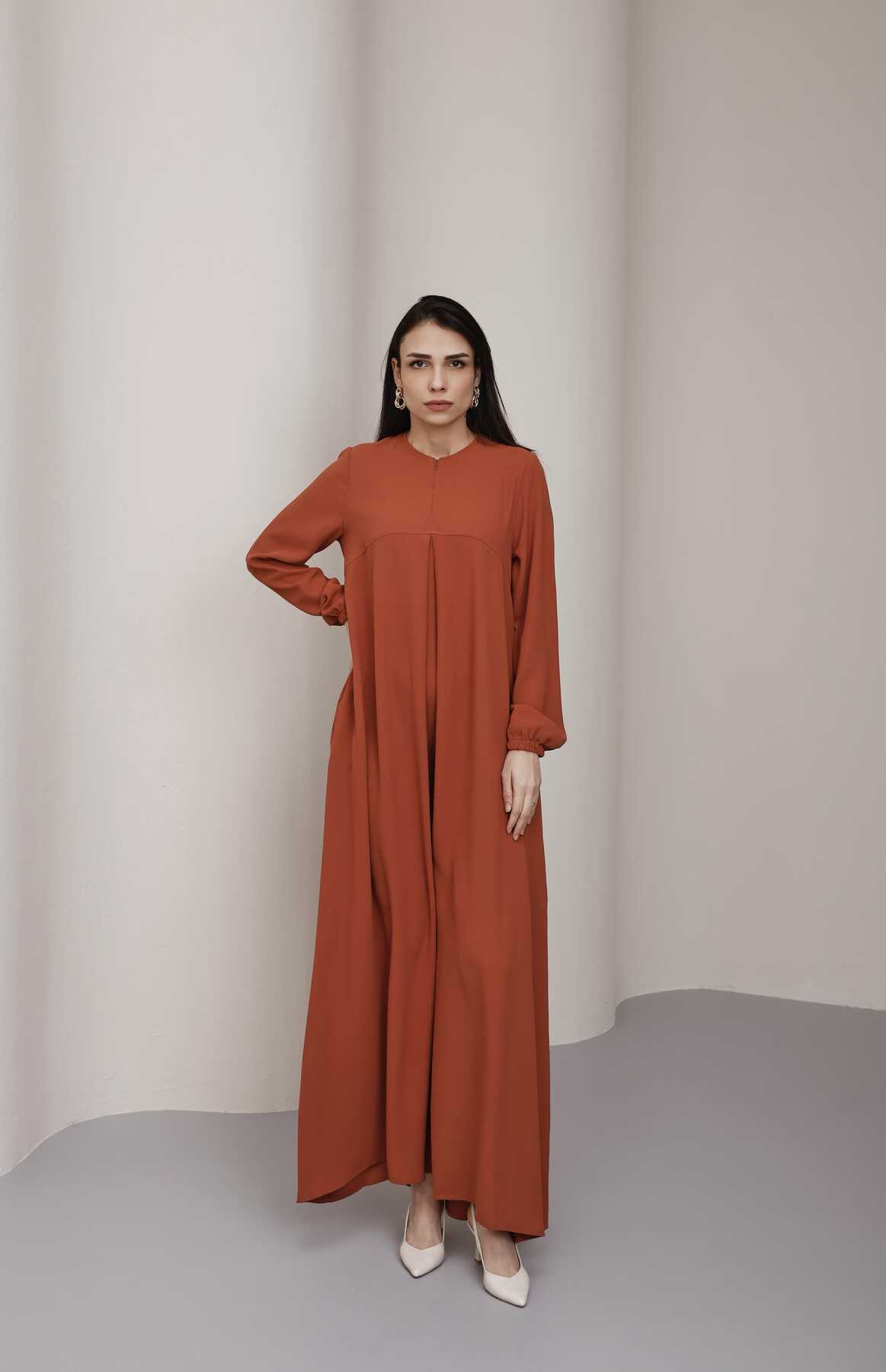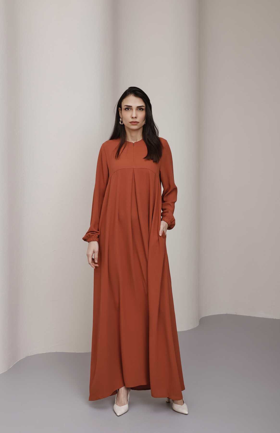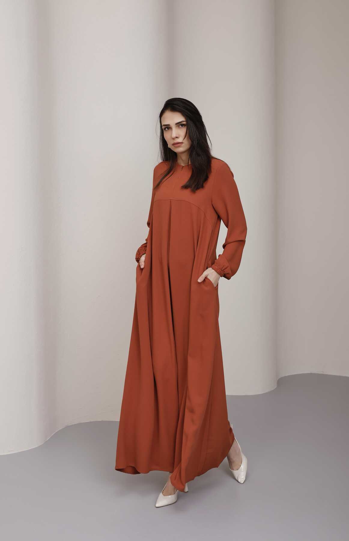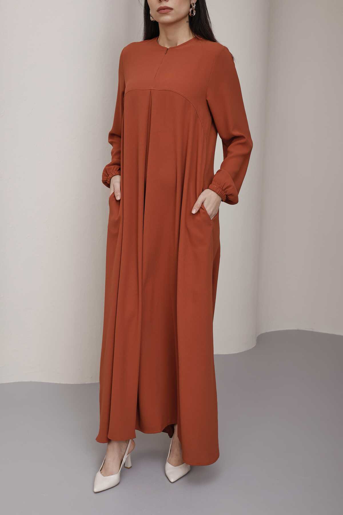 - Ürün Adı : 6482-Ön Tek Pileli Krep Elbise Taba