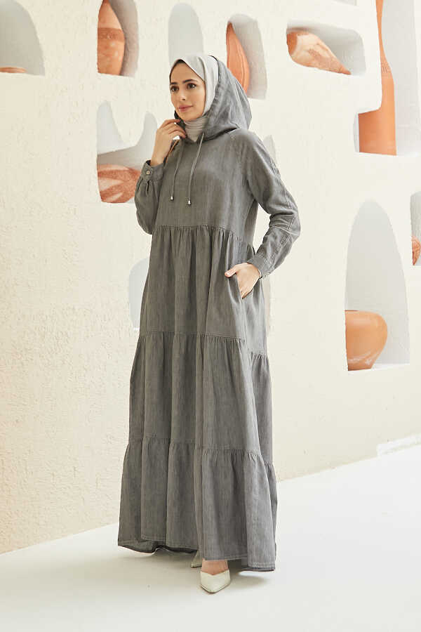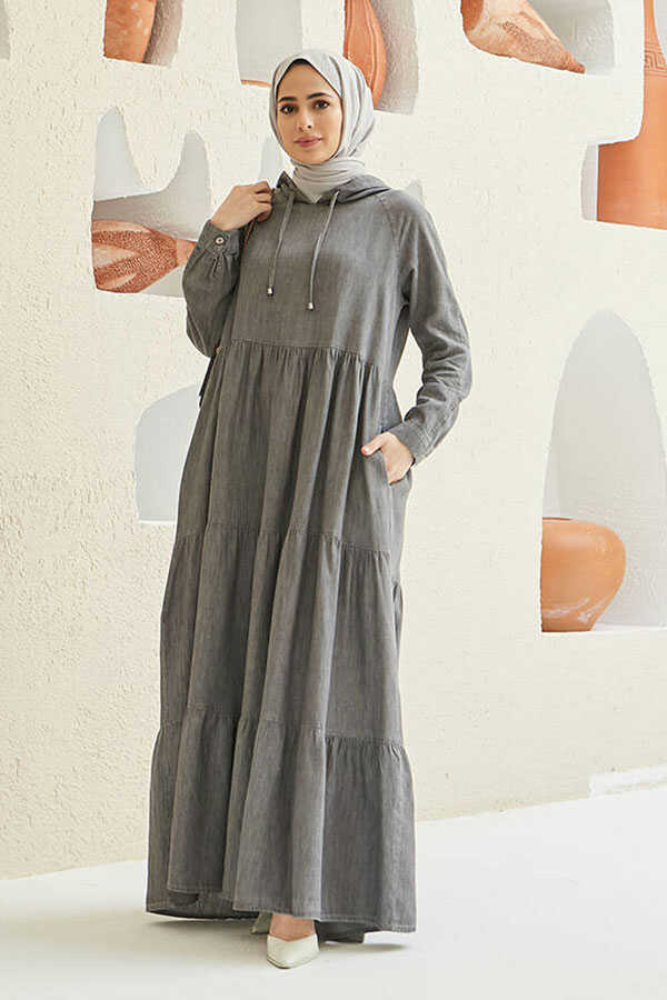 6531-Denim Kapşonlu Reglan Kollu Elbise Gri