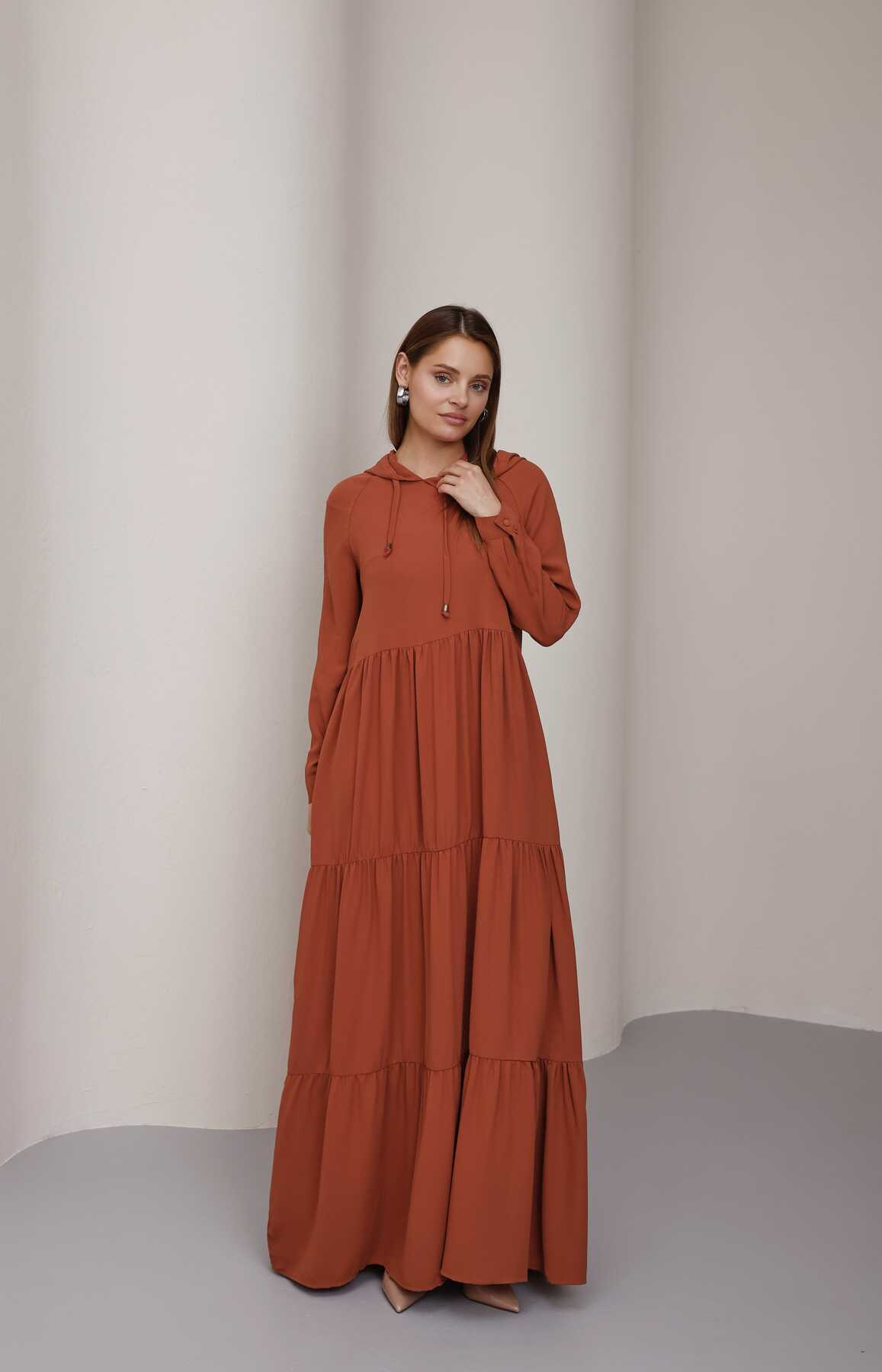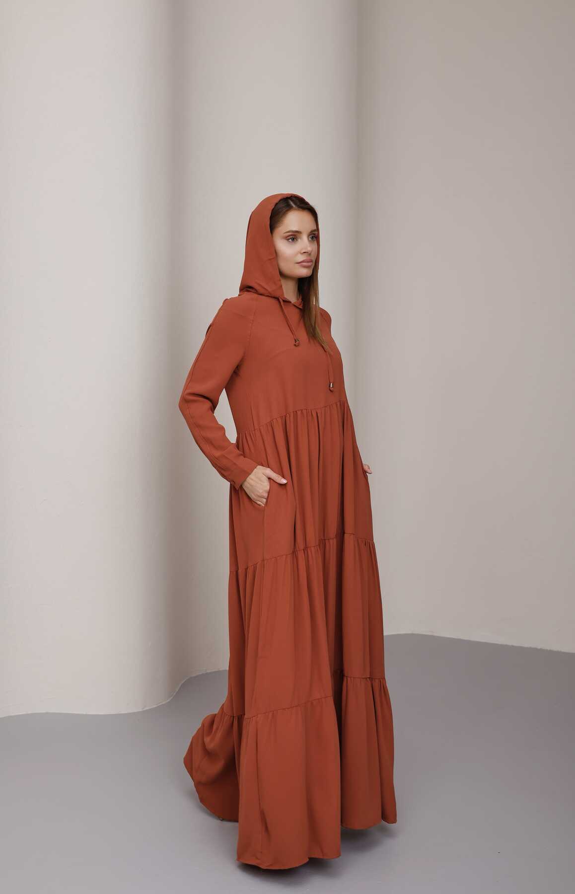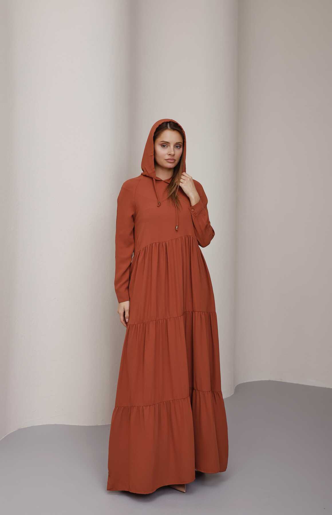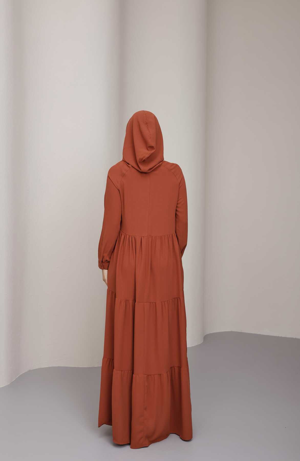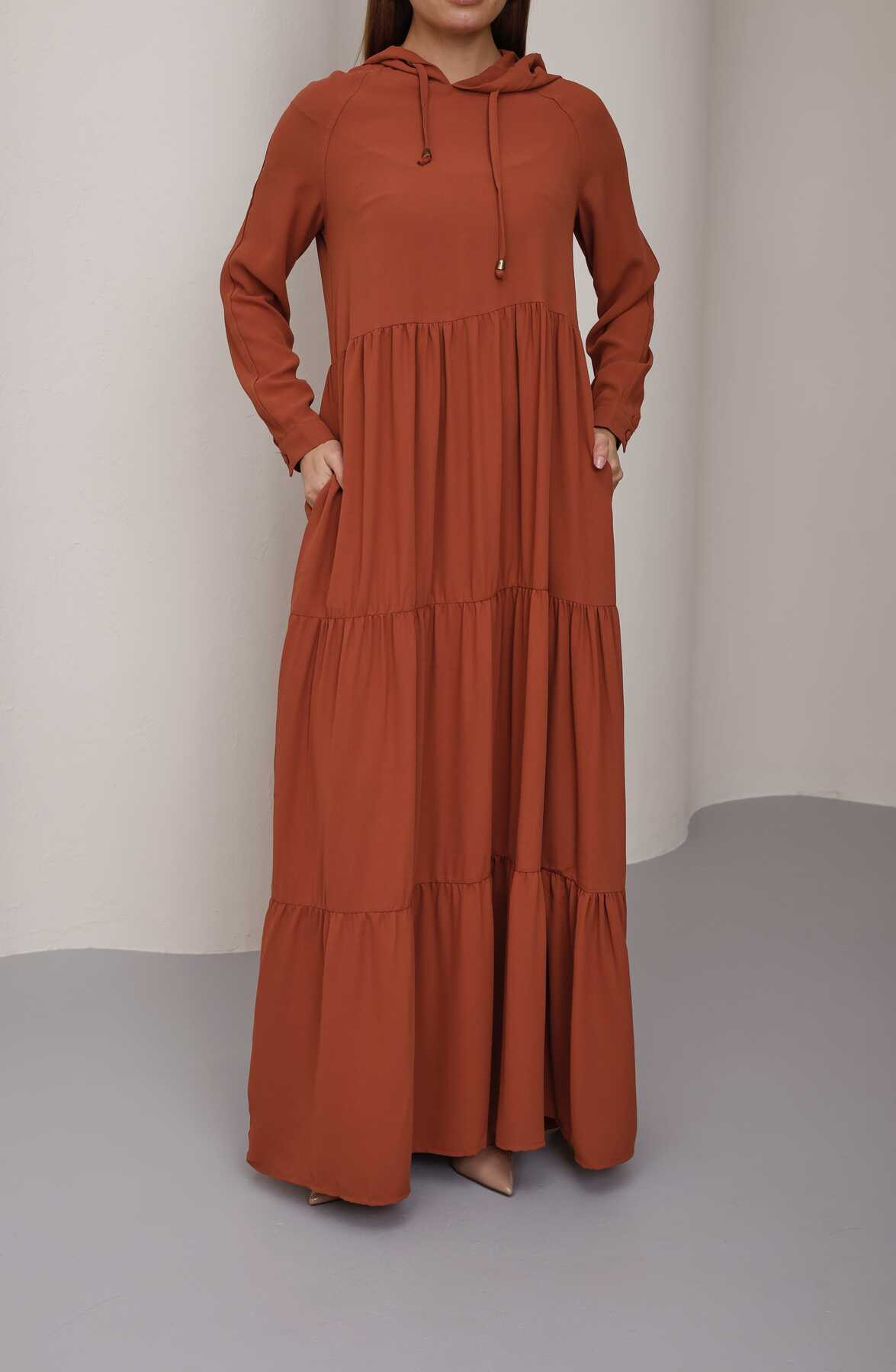 - Ürün Adı : 6531-Krep Kapşonlu Reglan Kollu Elbise Taba