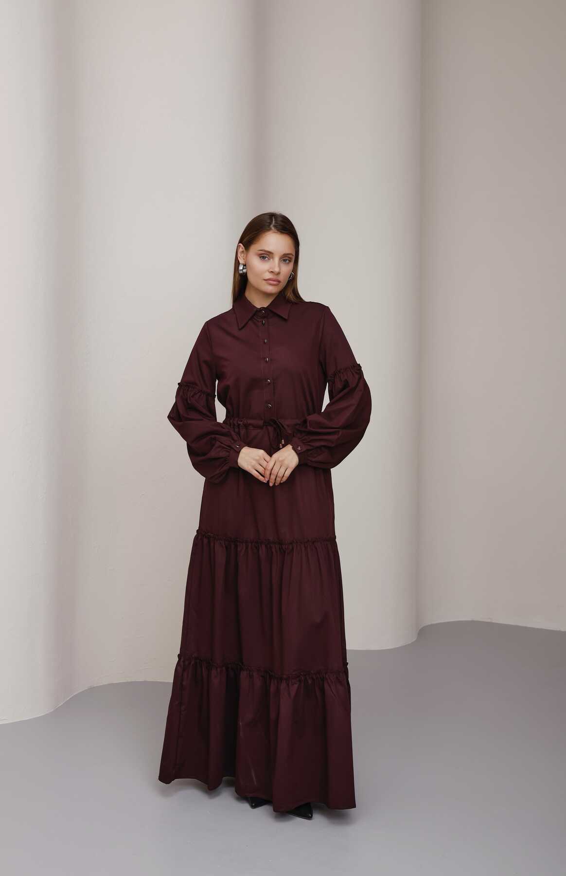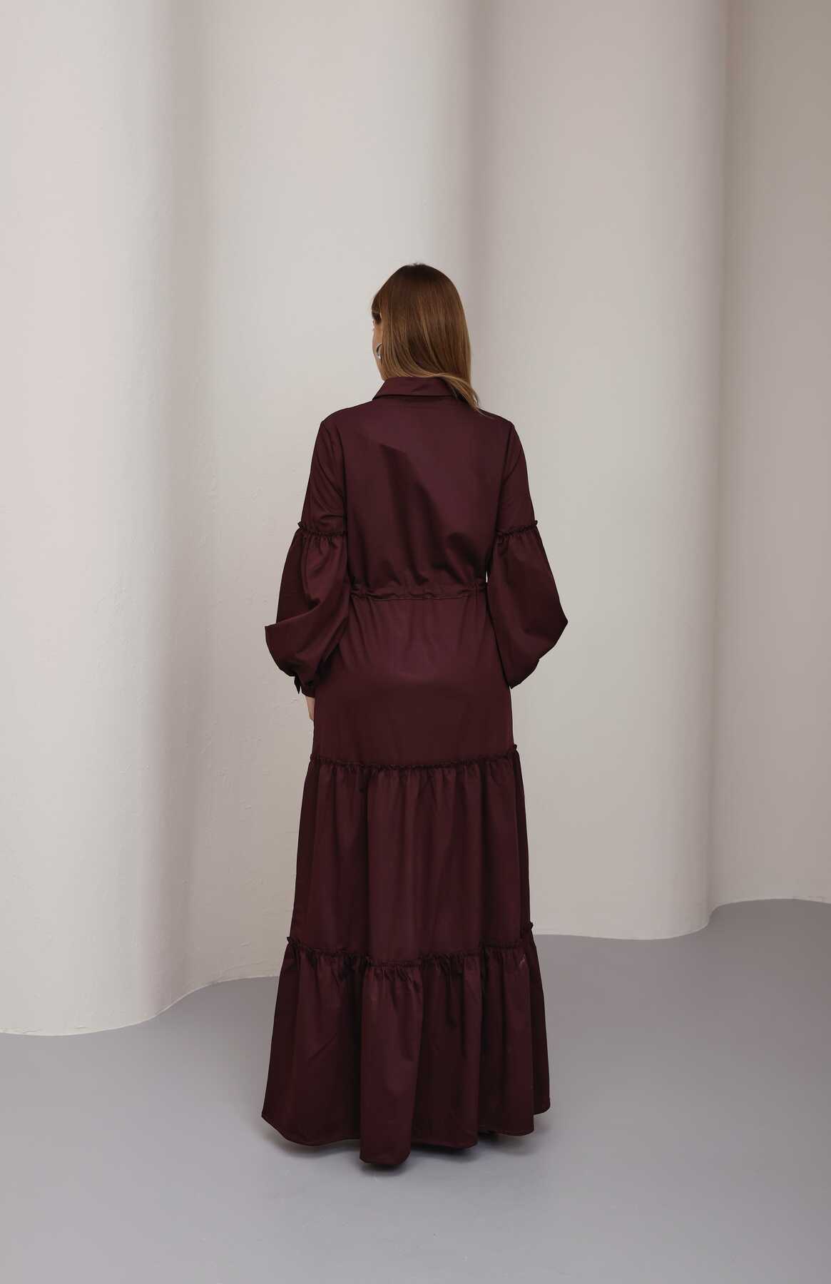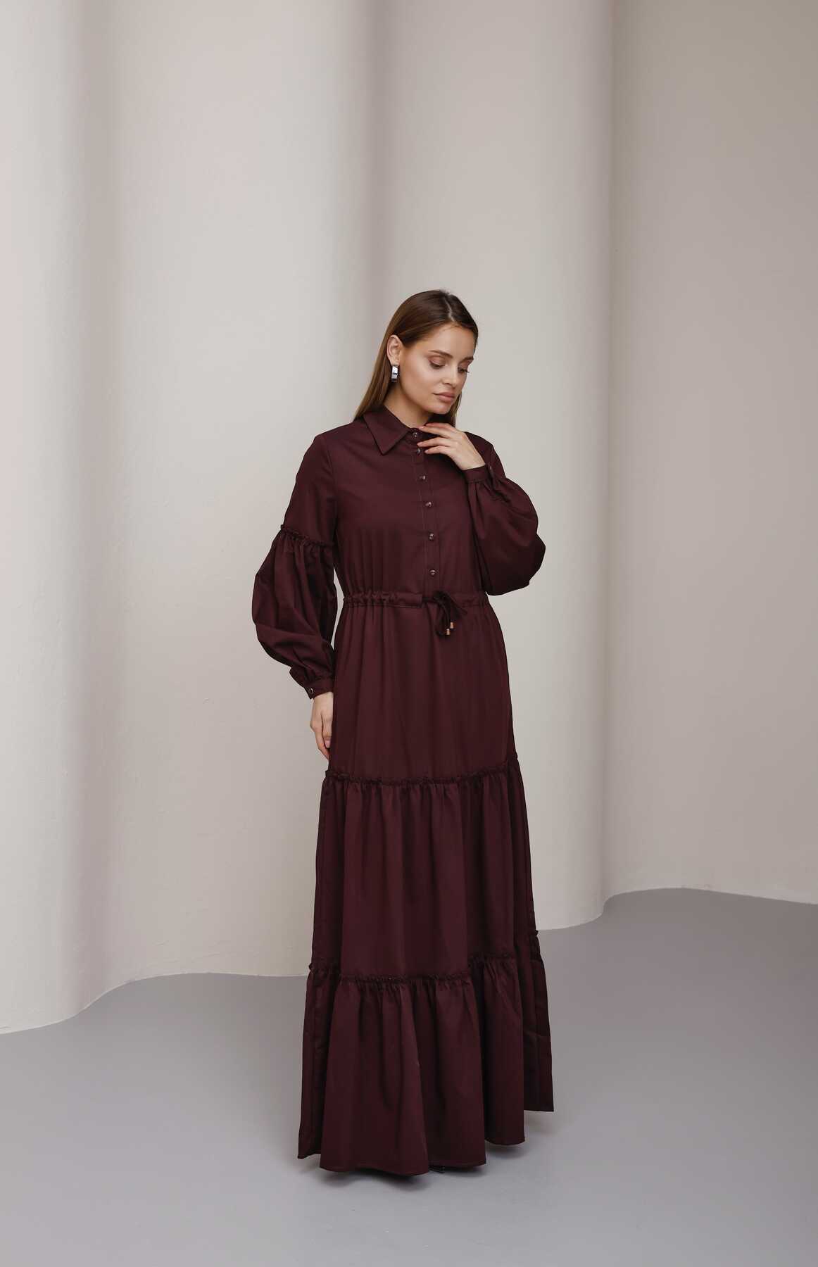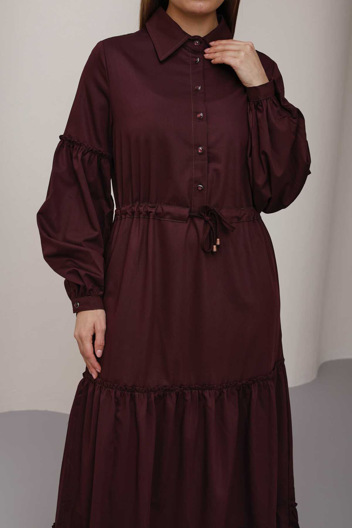 6567-Büzgülü Bağcıklı Elbise Bordo