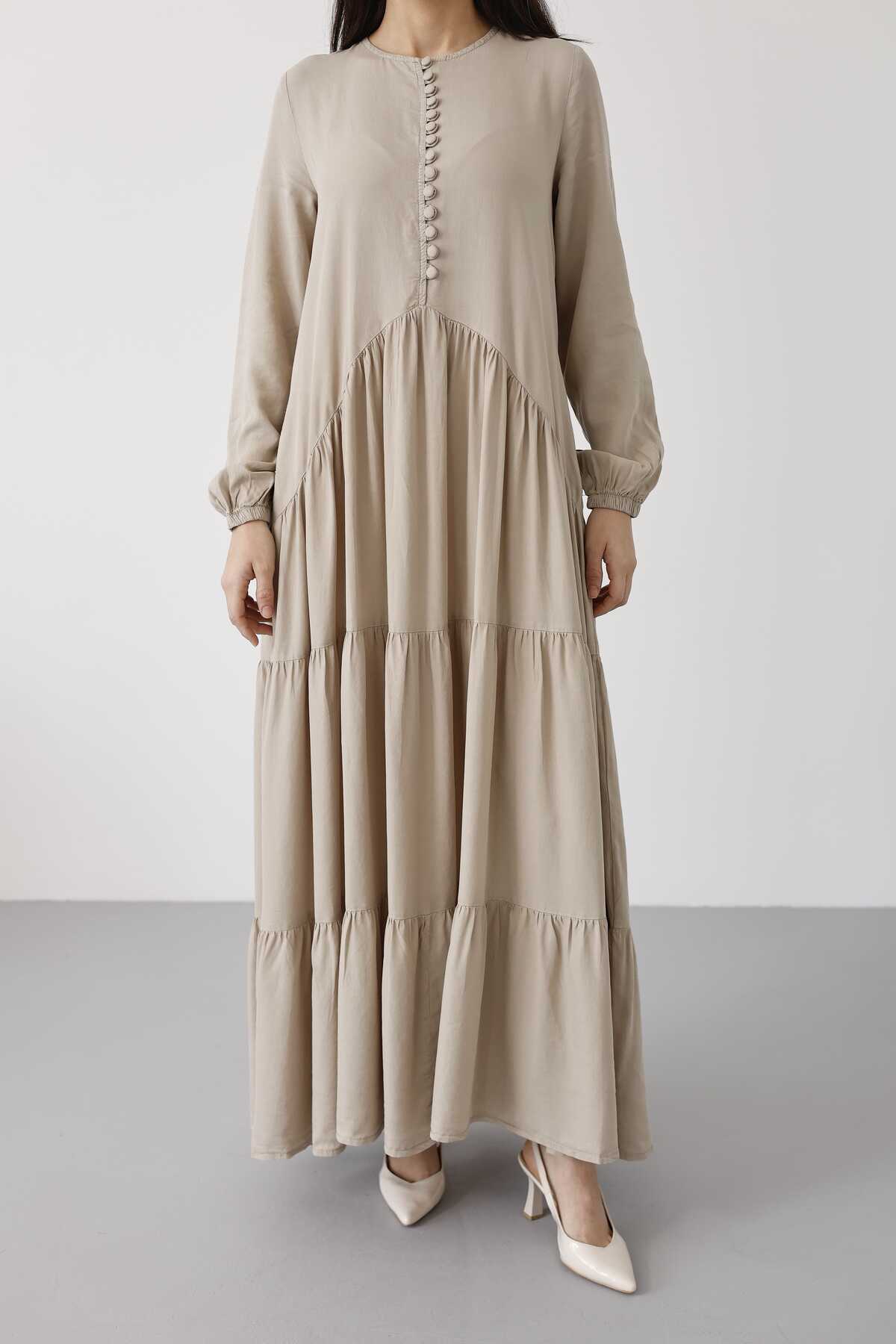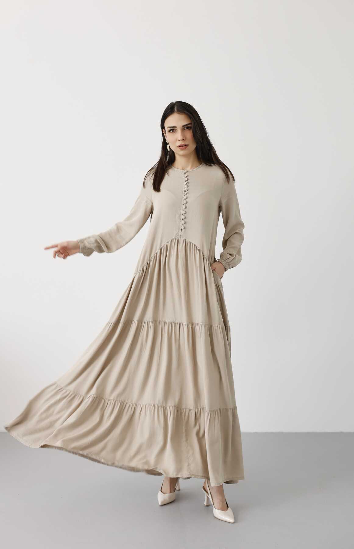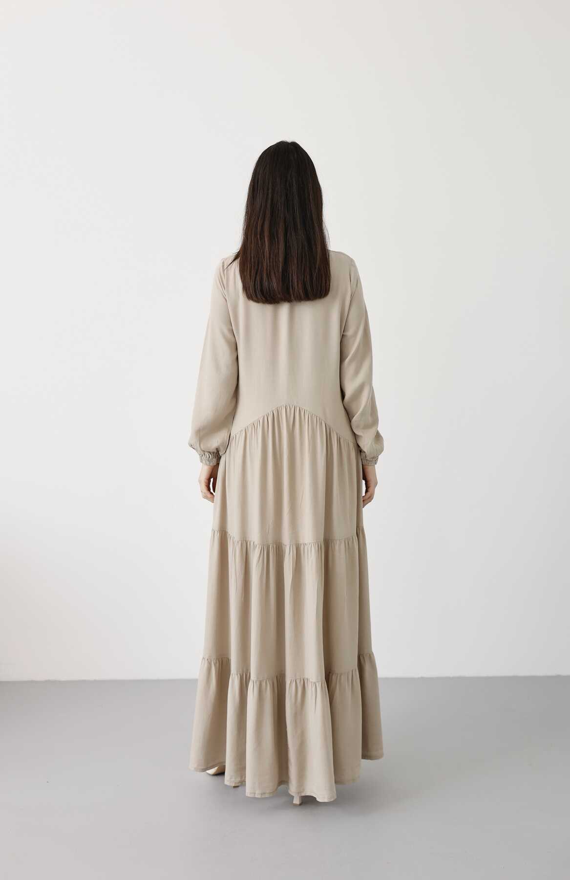 - Ürün Adı : 6646- Parça Boya Tensel Britli Düğmeli Büzgülü Elbise Bej