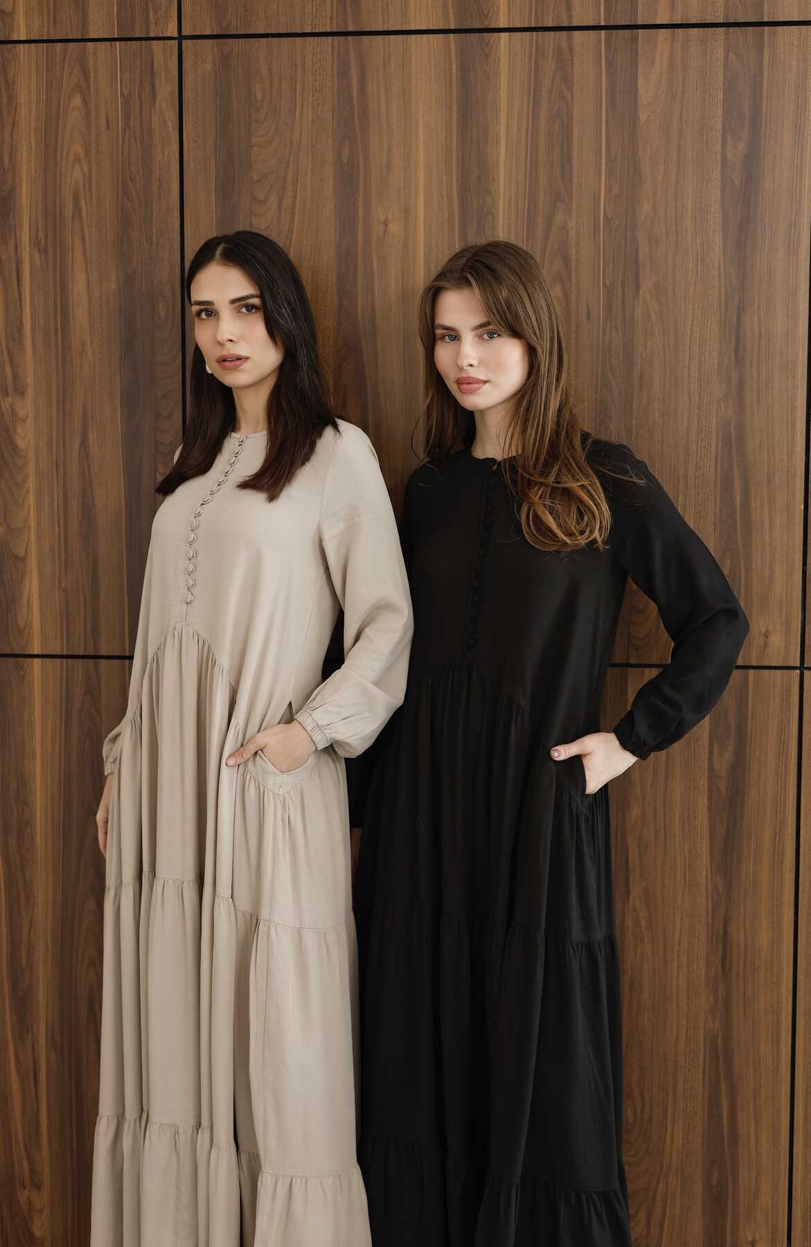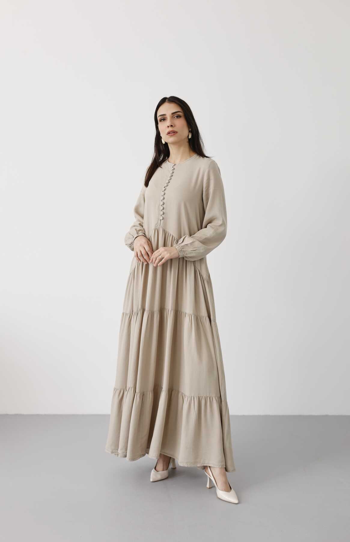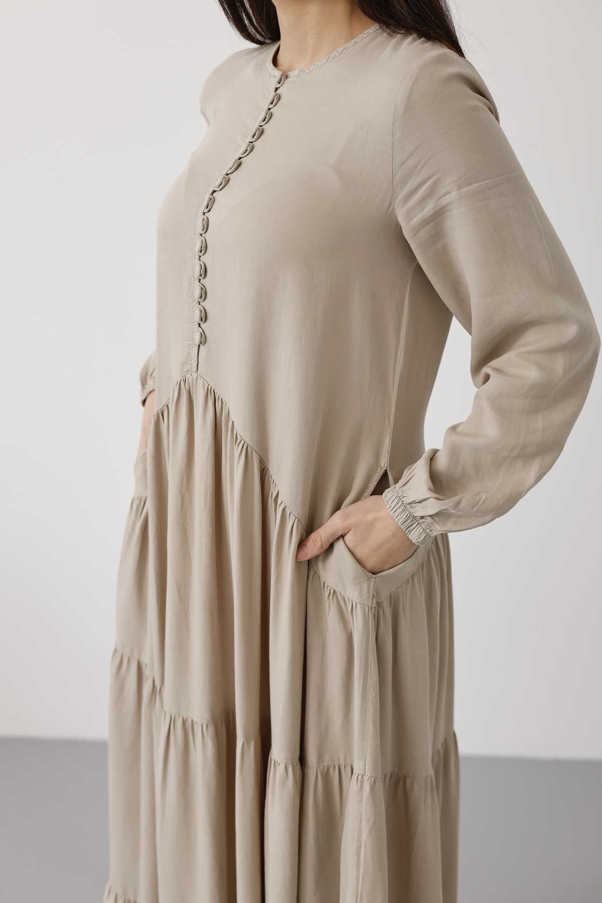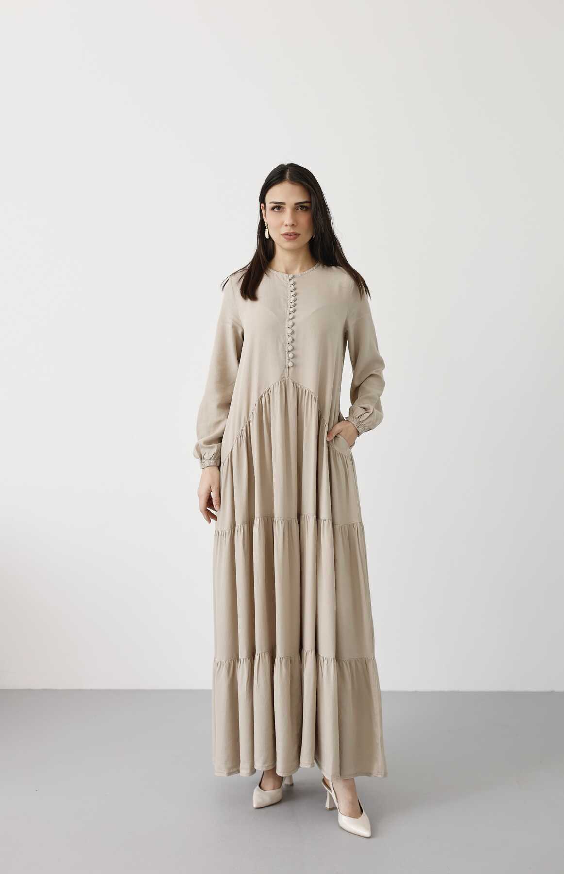 - Ürün Adı : 6646- Parça Boya Tensel Britli Düğmeli Büzgülü Elbise Bej