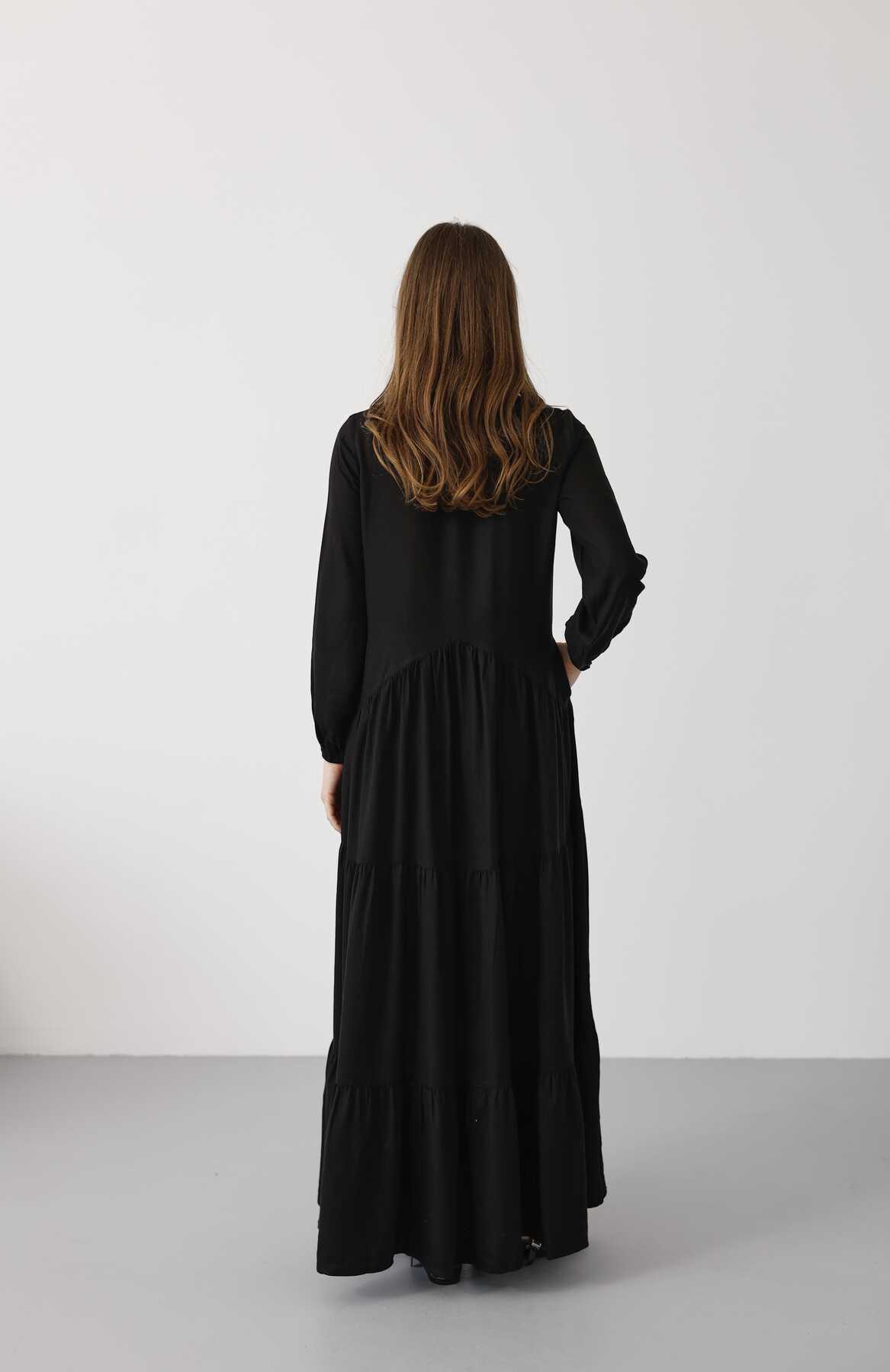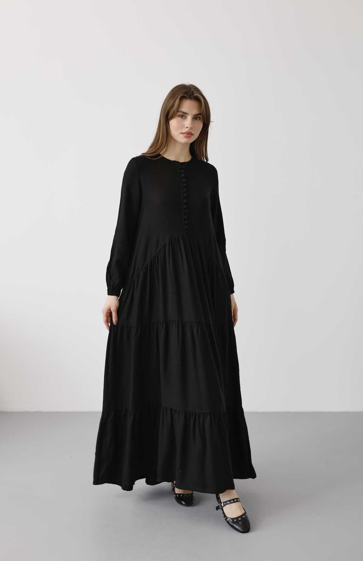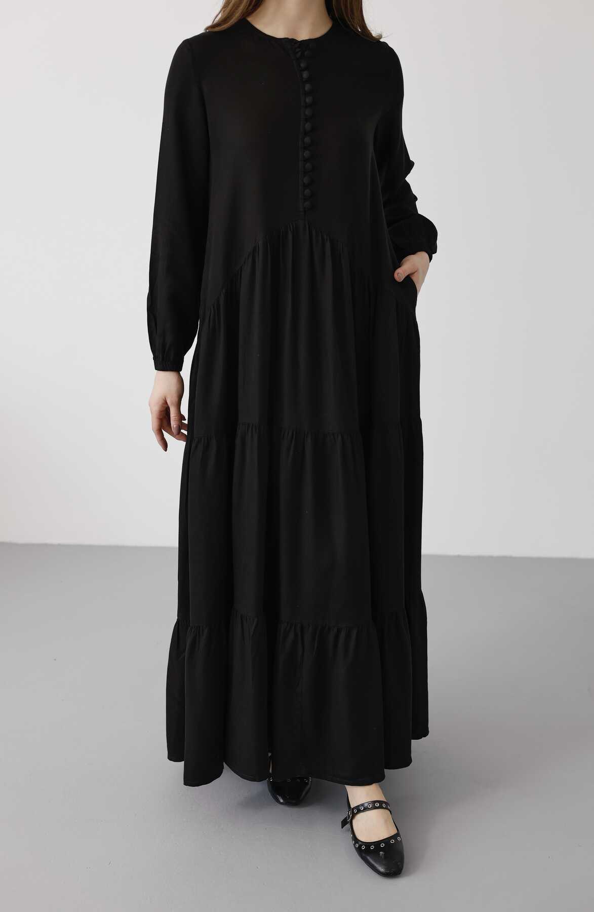 6646- Parça Boya Tensel Britli Düğmeli Büzgülü Elbise Siyah