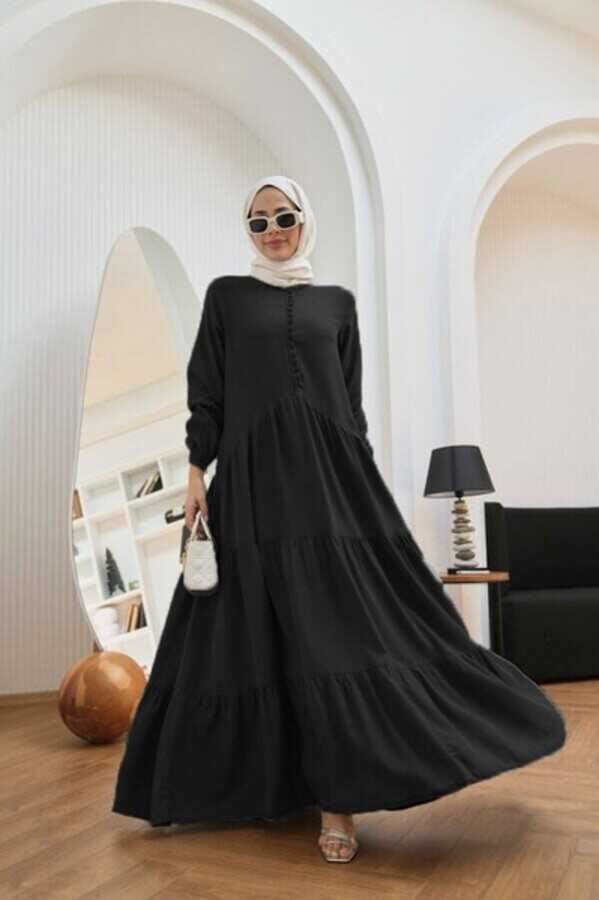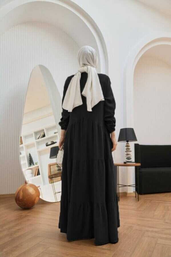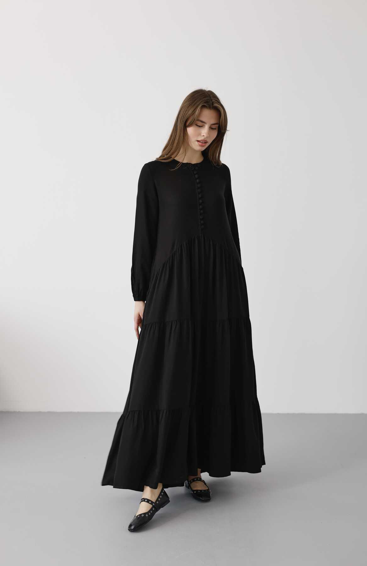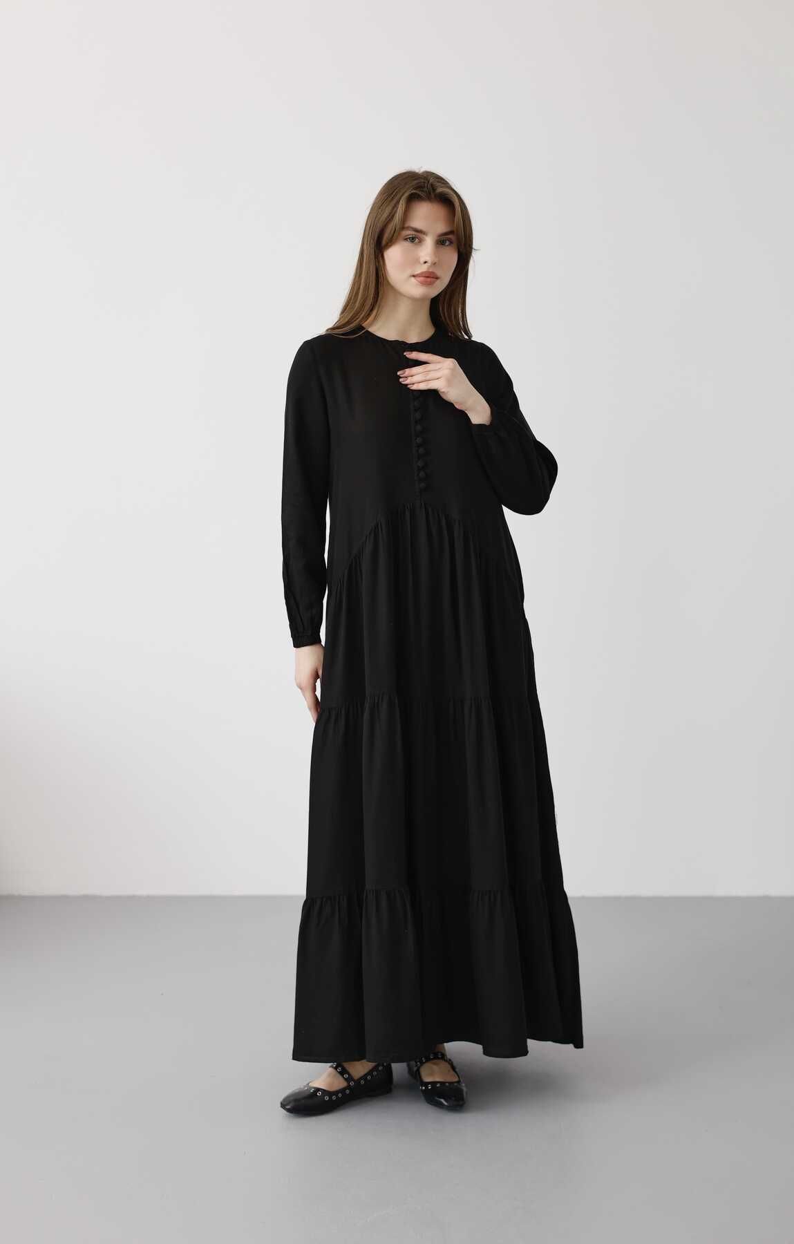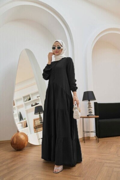 6646- Parça Boya Tensel Britli Düğmeli Büzgülü Elbise Siyah