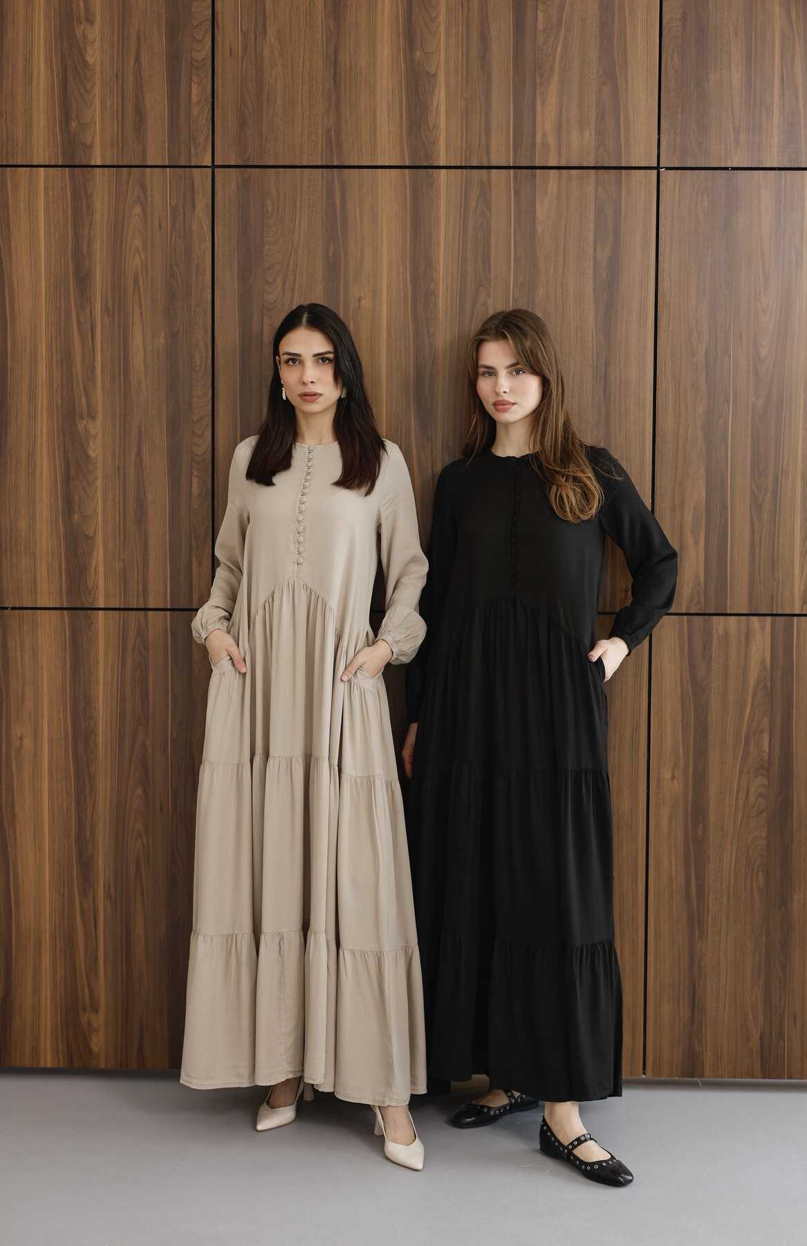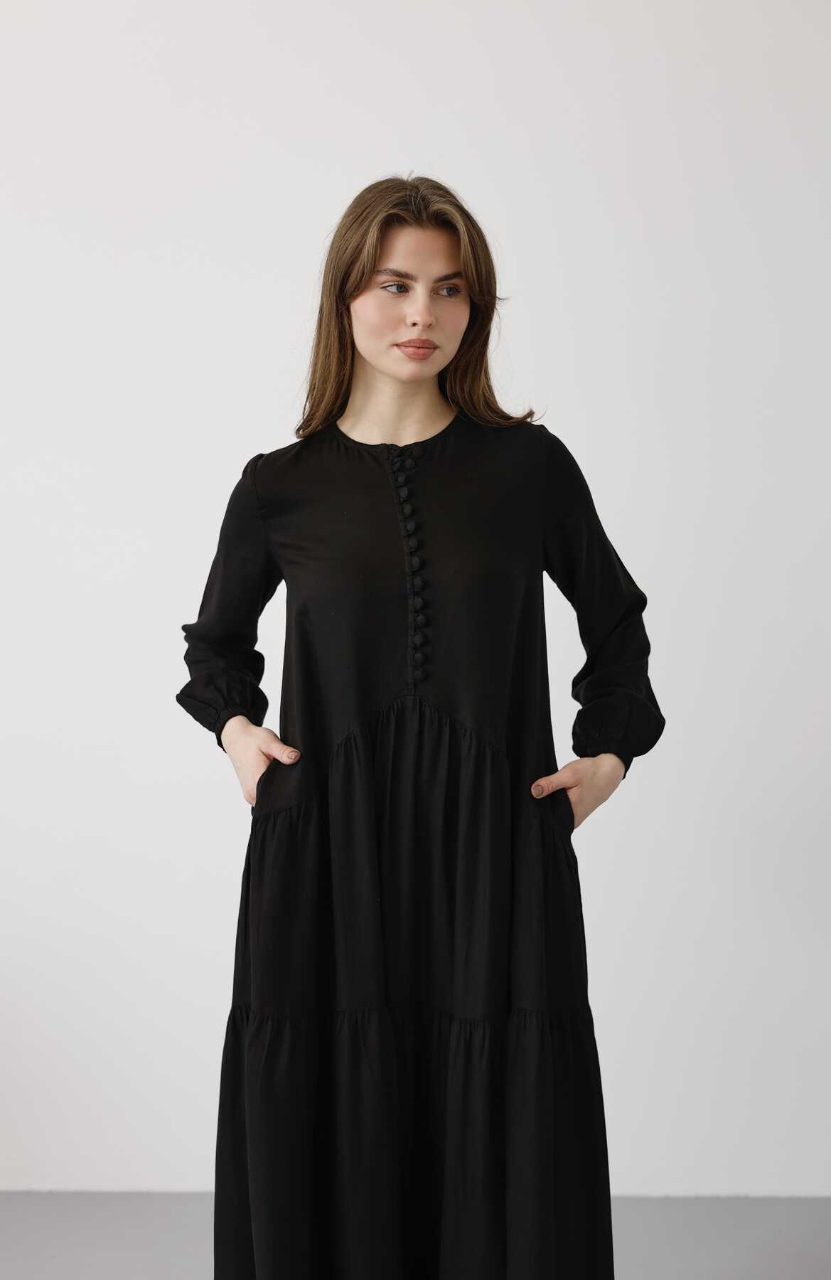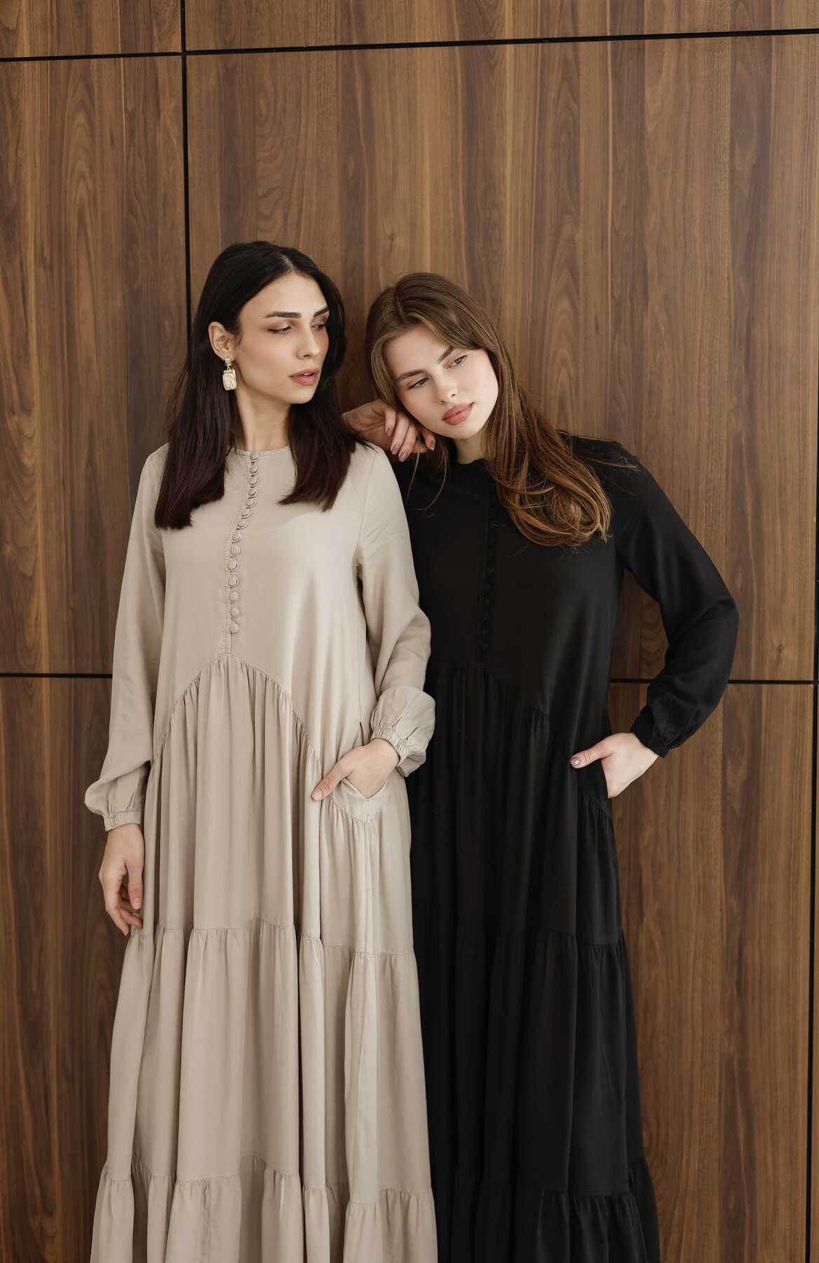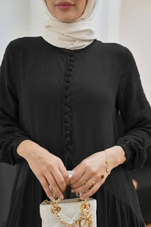 - Ürün Adı : 6646- Parça Boya Tensel Britli Düğmeli Büzgülü Elbise Siyah